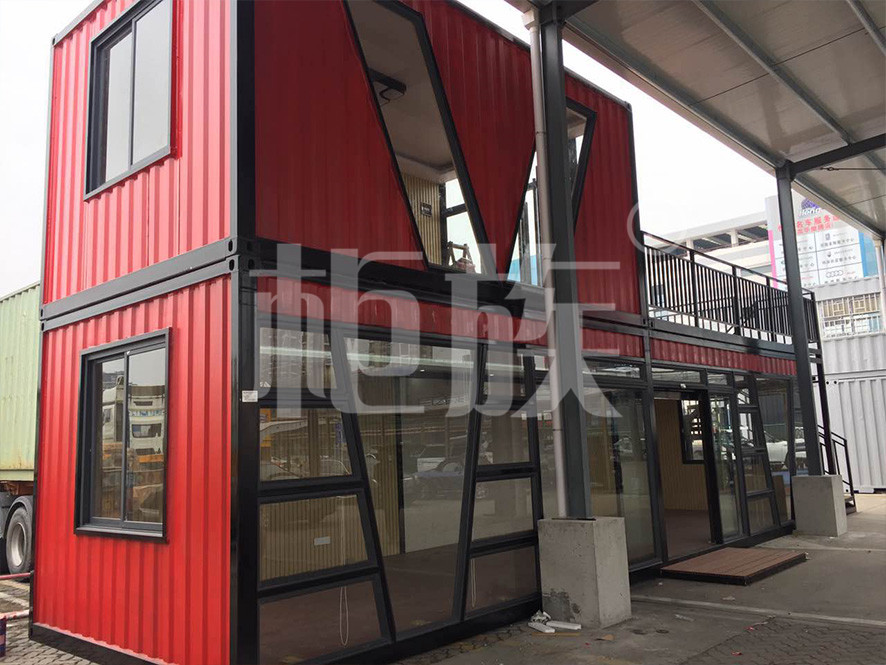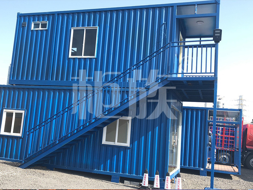Small but fine office, the first floor office with awning, side stairs to the second floor platform. Strong bearing capacity, box top vertical LED advertising screen. The indoor toilet can be used for both accommodation and short rest.